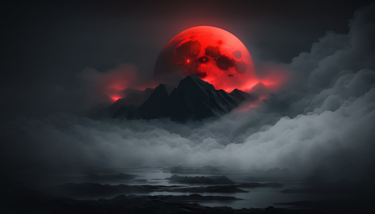 红色月亮下的神秘山脉