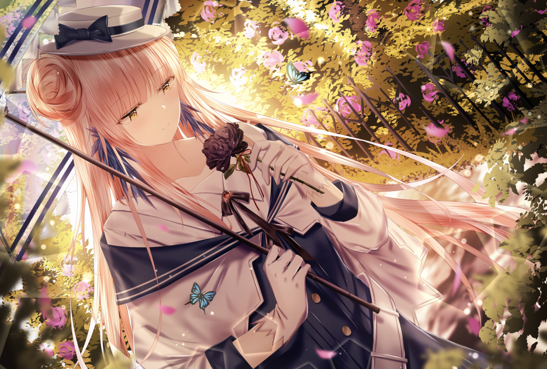 金发、长发、戴帽子的女人、动漫、连衣裙、鲜花、蝴蝶