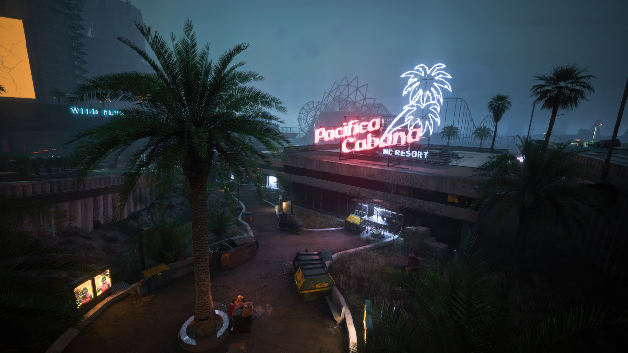 赛博朋克、棕榈树、度假村、过山车、摩天轮、道路、汽车、视频、游戏、艺术