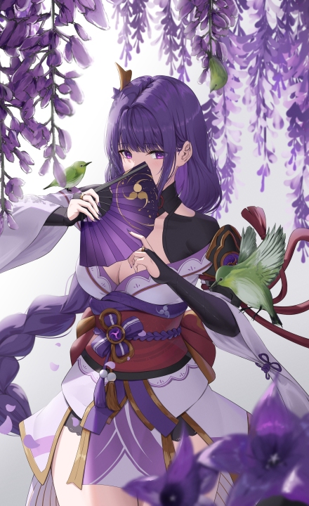 鼹鼠、痣、辫子、长发、紫色头发、原神、动漫、女孩、扇子、花、鸟、动物、花瓣、紫色眼睛