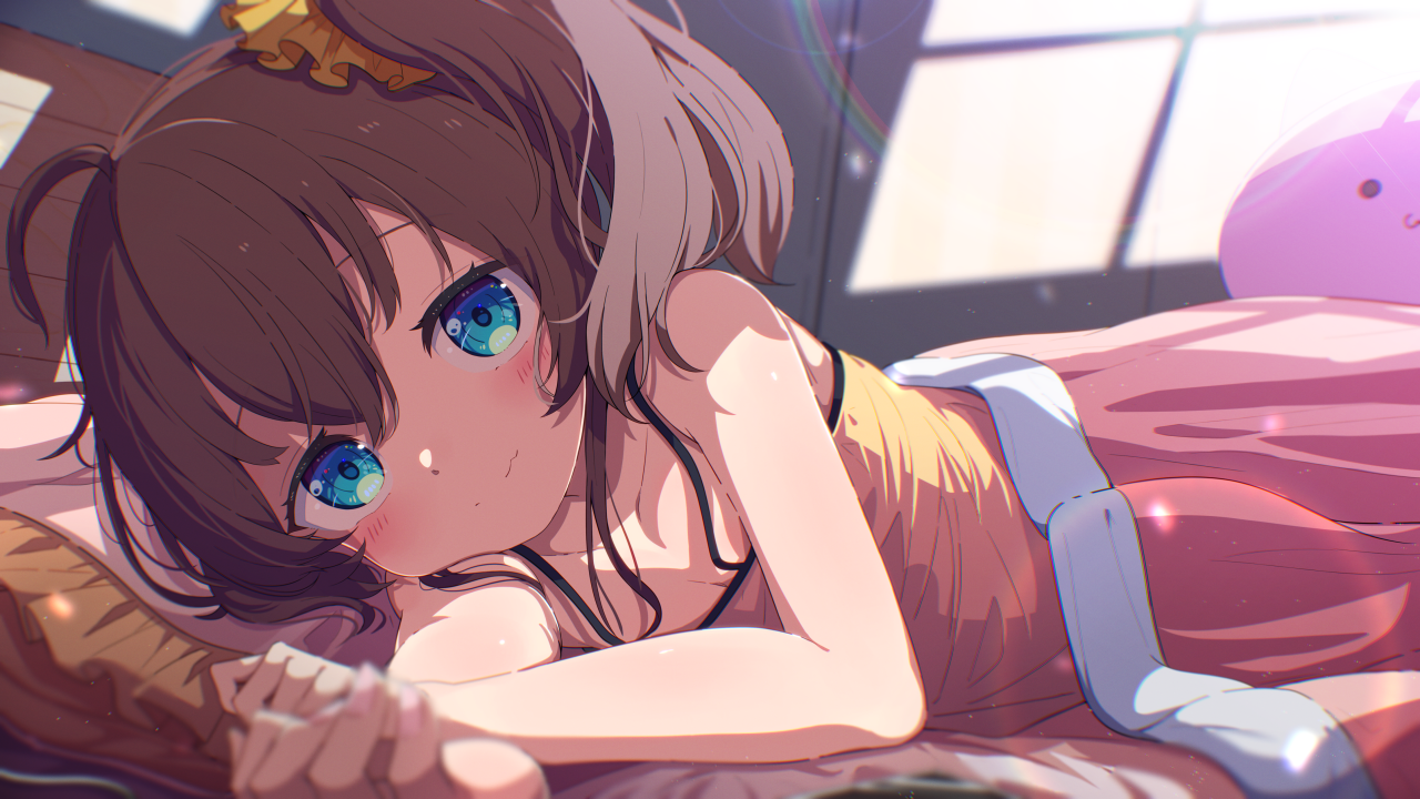 黑发、蓝眼睛、躺着、侧躺、马尾辫、艺术、虚拟、床、室内、脸红、动漫女孩、阳光、彩虹、枕头、莉莉