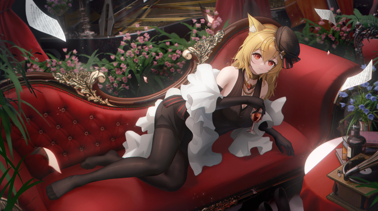 狐狸耳朵、狐耳、红眼睛、金发、动漫、女孩、黑色裤袜、连裤袜、明日方舟、狐狸女孩、狐女、葡萄酒、酒杯、帽子、纸、花、沙发