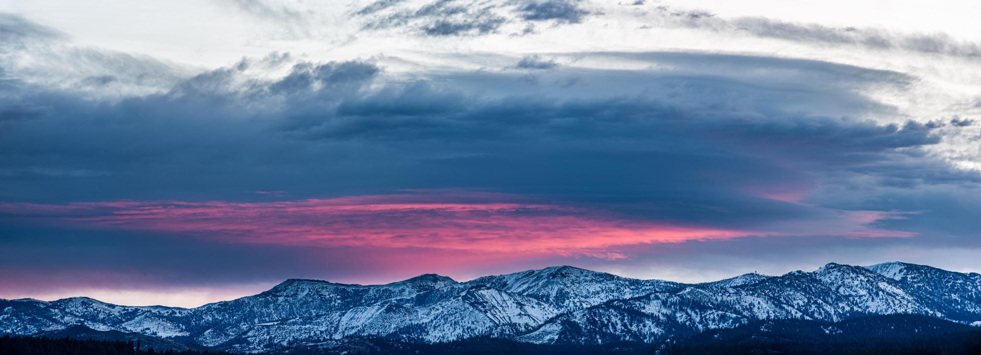 云、日落、冬天、山脉、森林、美国内华达州、北美、全景、风景、自然