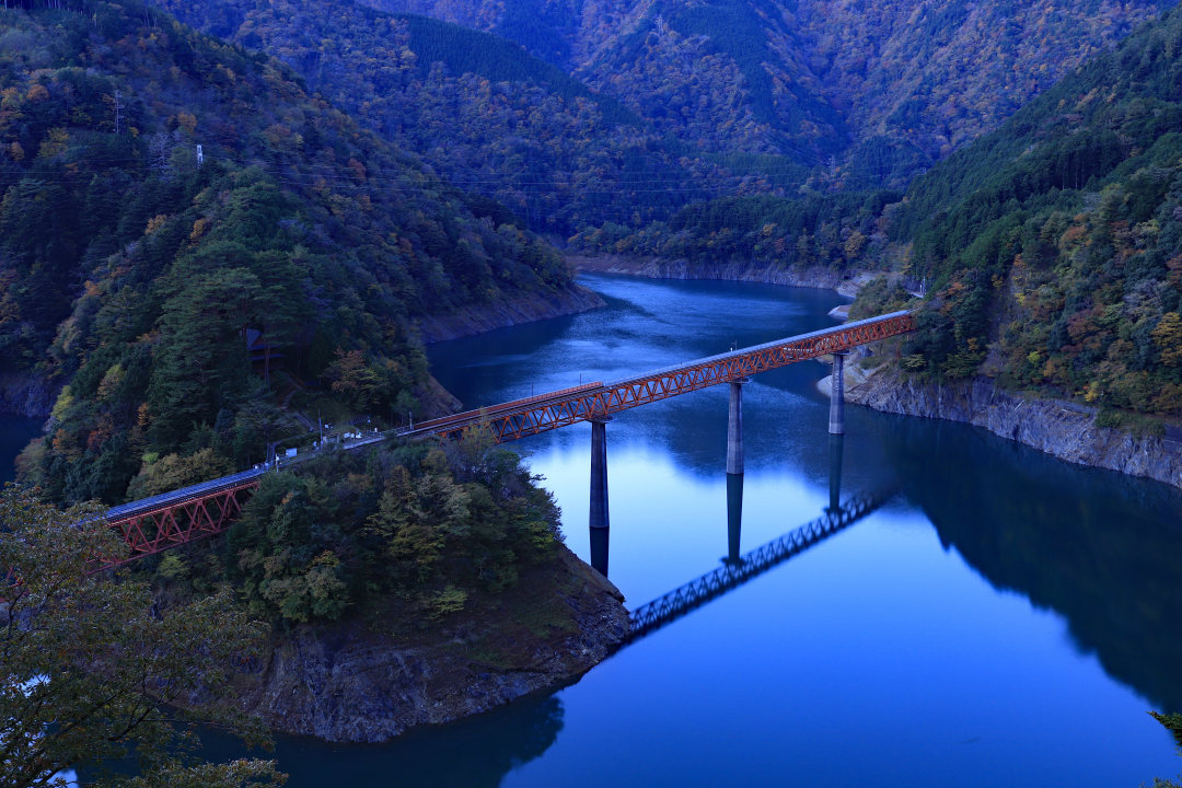 蓝色、夜晚、黄昏、前灯、公寓、路灯、下雪、人行道、电线、树木、城市、火车、桥梁、栏杆、忧郁