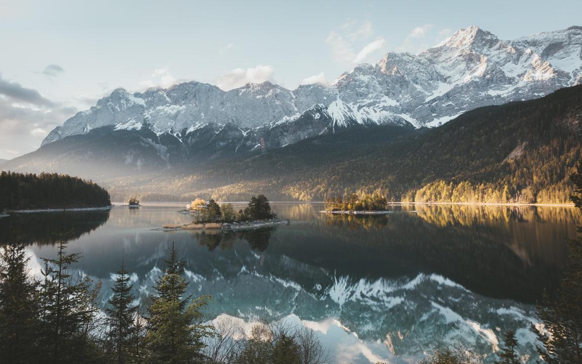 风景、艾比西湖、湖泊、山脉、森林、自然、雪、日落、巴伐利亚、反射