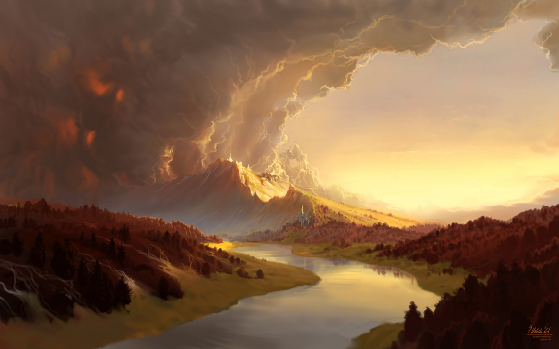 日落时分的梦幻山脉与城堡