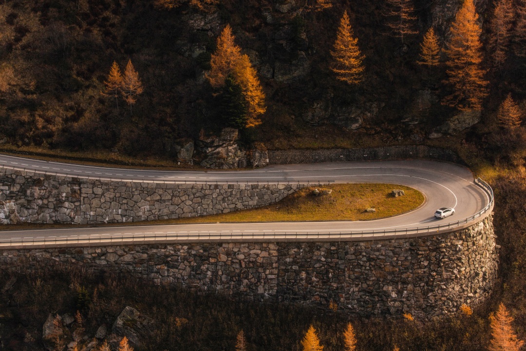 森林、秋天、曲折的道路、行驶的汽车、瑞士、松树