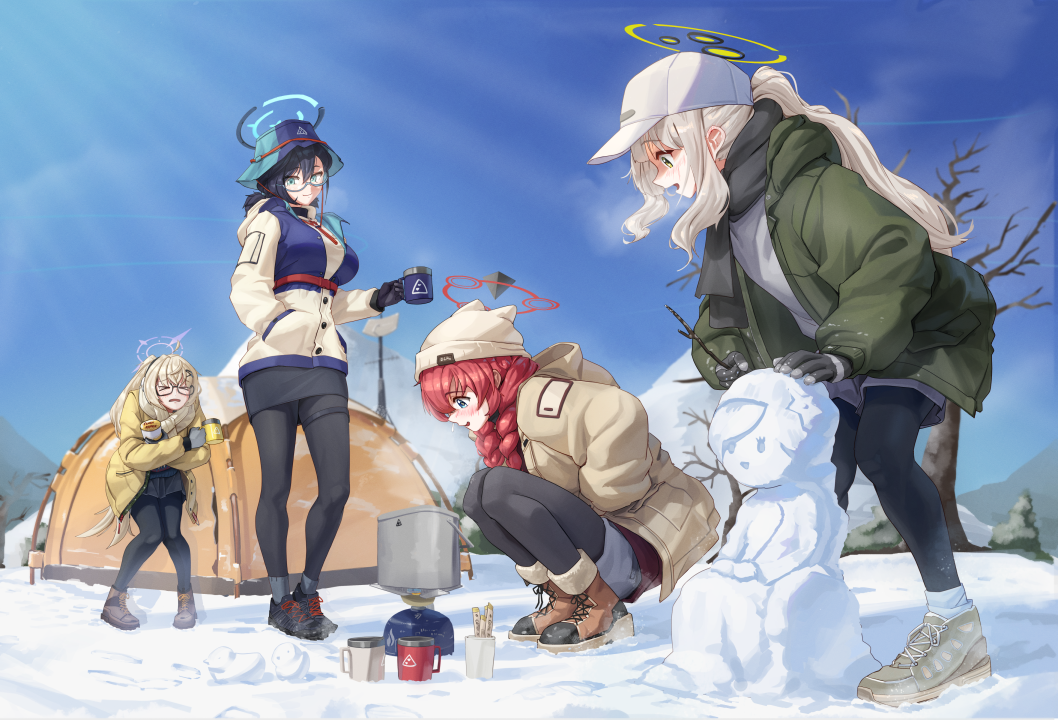 微笑、户外、女人、长发、马尾辫、艺术家、头发、雪人、连裤袜、夹克、围巾、天空、长袖、雪、云、帽子、饮料、食物、帐篷、兜帽