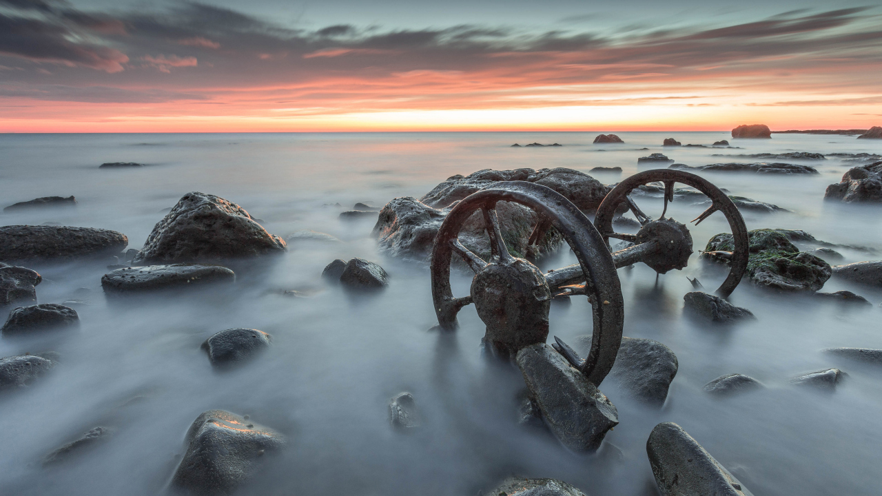 岩石、日落、夕阳辉光、自然、废墟、车轮