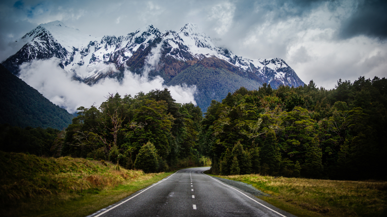 摄影、风景、新西兰、自然、山脉、道路、雪、树、云