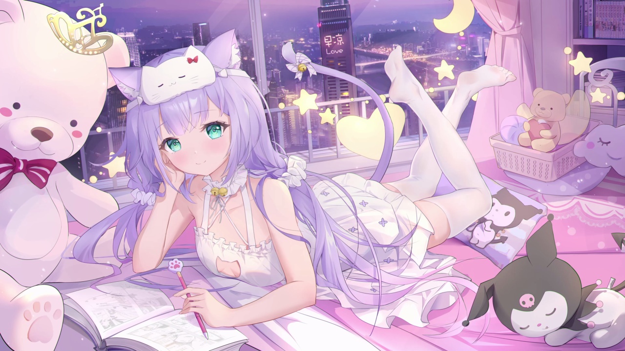 可爱的、粉色、紫色、动漫女孩、二次元