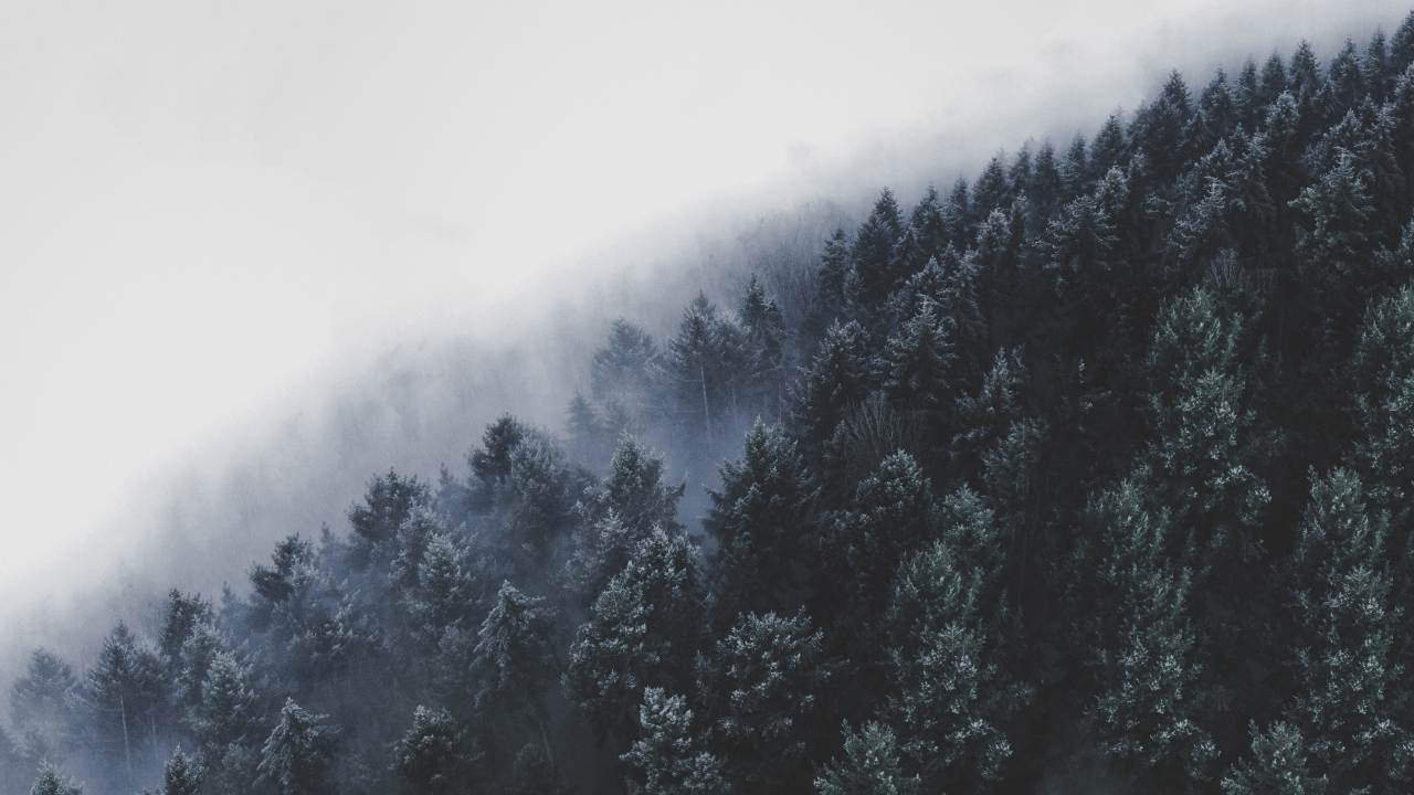 森林、薄雾、雪、冬天、寒冷、云杉、鸟瞰