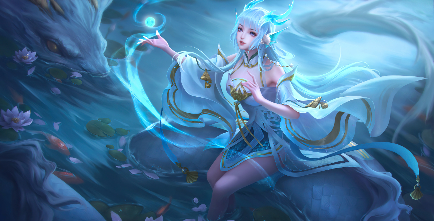 游戏CG、人物、蓝头发、王者荣耀、水、龙、动物