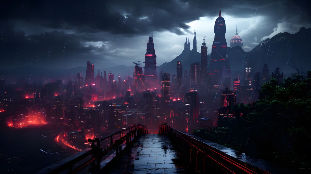 赛博朋克、城市、艺术、城市灯光、AI艺术、云、雨、天空