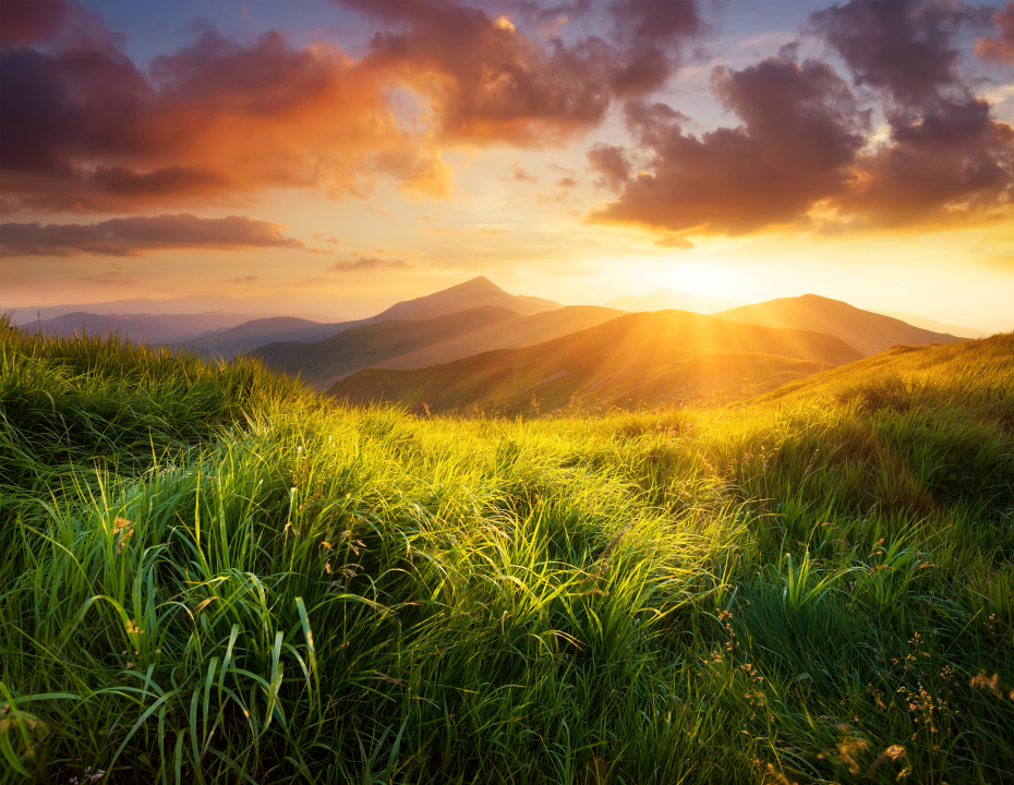 自然、风景、山脉、日落、树木、水、天空云、阳光、草、植物