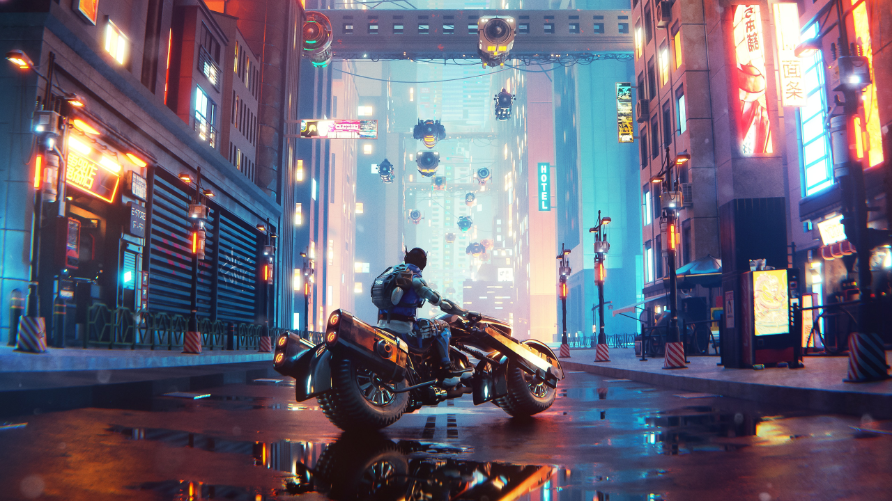 AI艺术、插画、城市、未来主义城市、赛博朋克、城市灯光、倒影、幻想城市、街道