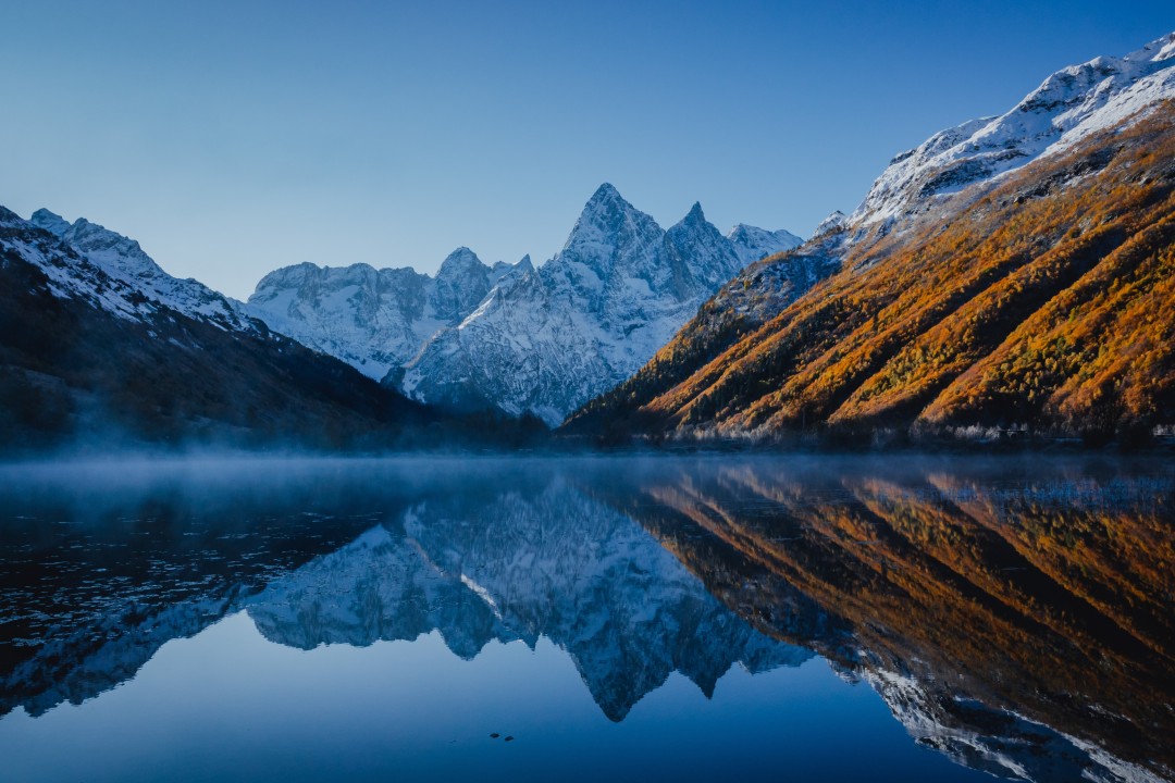 山、雪峰、雪、水、倒影、晴朗的天空、自然