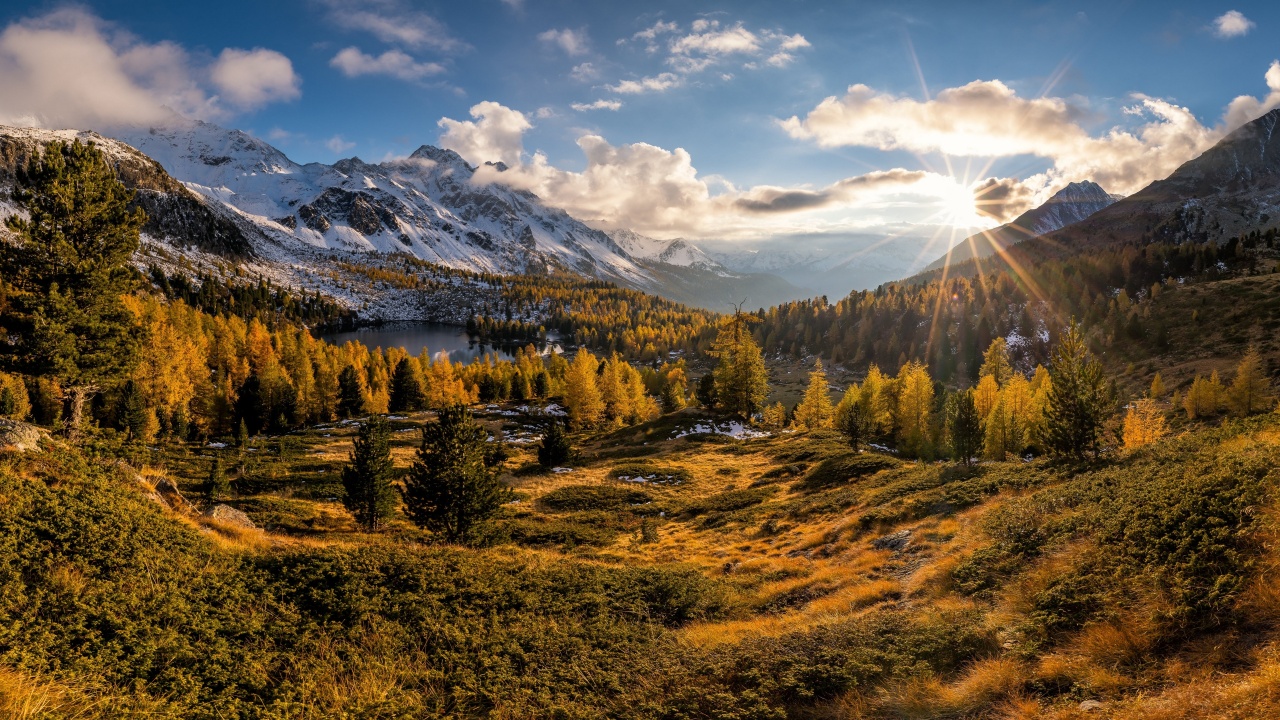 自然、风景、秋天、日落、太阳、山脉、雪、天空、云、树、森林、湖泊、水、阳光