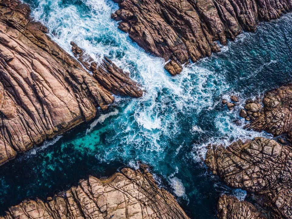 岩石、大海、海浪、鸟瞰、青绿色、蓝色