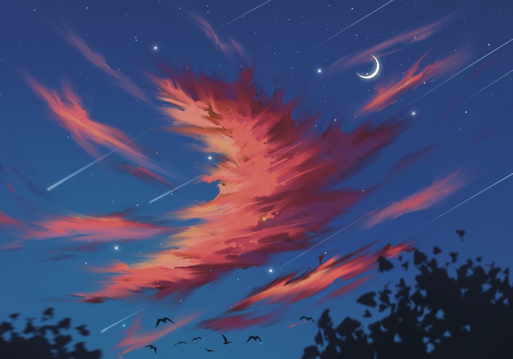 数字艺术、艺术品、插图、绘画、天空、云、月亮、鸟、动物、星星、流星