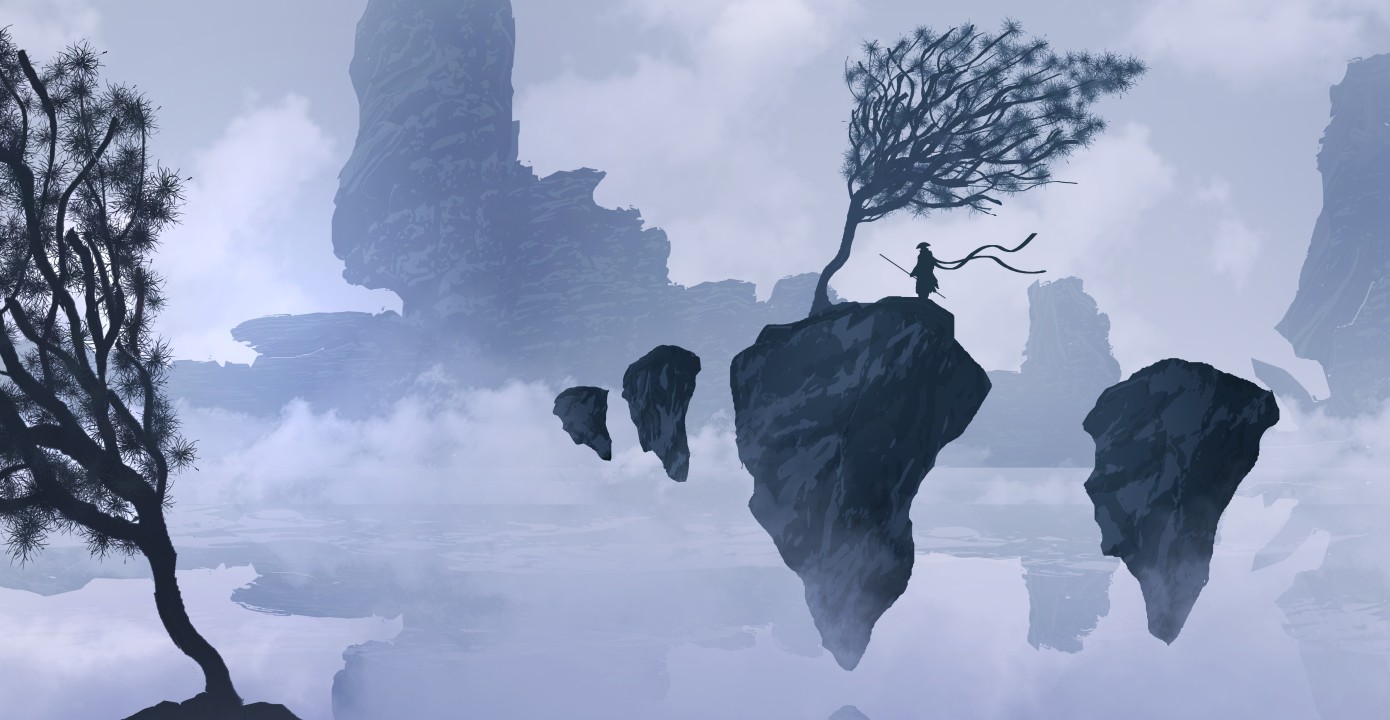 奇幻的浮石与武士剪影