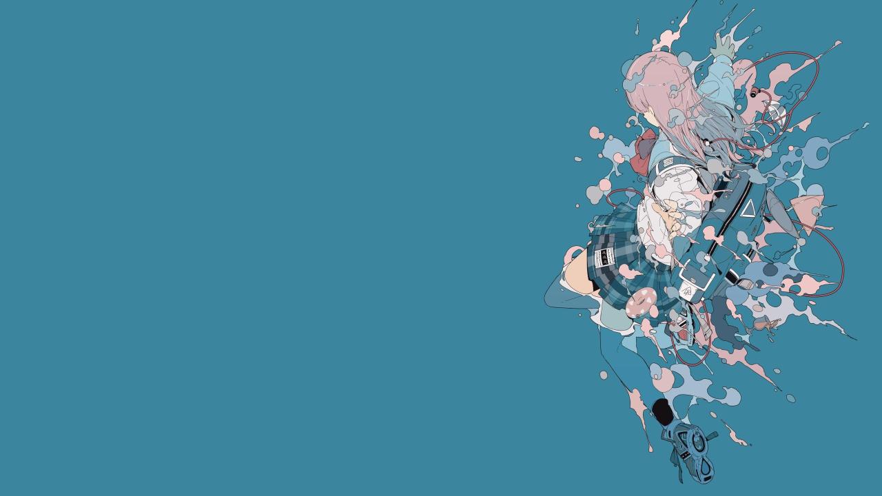 原创、人物、动漫、女孩、简单背景、蓝色背景、极简主义、背包、水