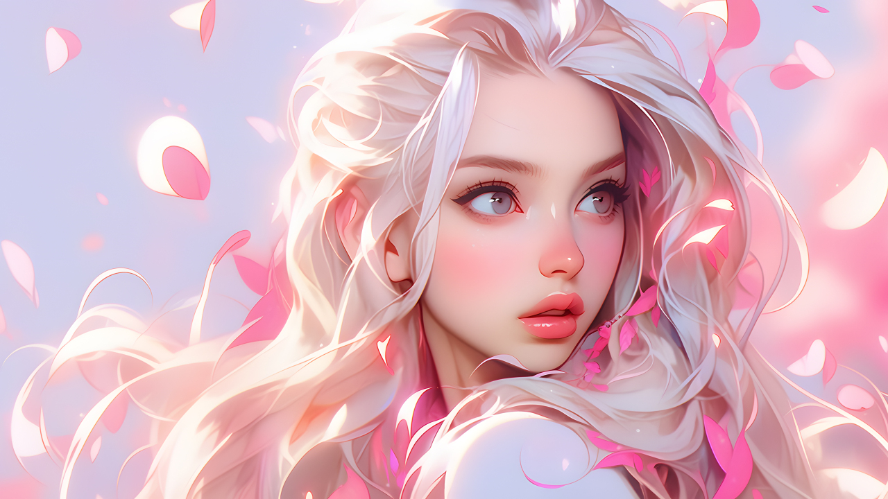 女人、长发、白发、灰色、眼睛、艺术、花瓣
