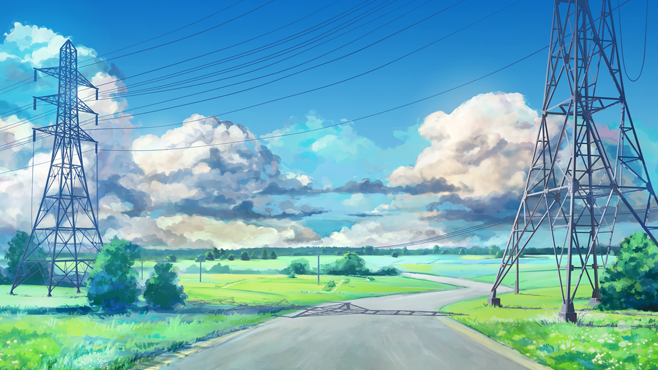 电线、云、天空、电线杆、草地、道路、积云