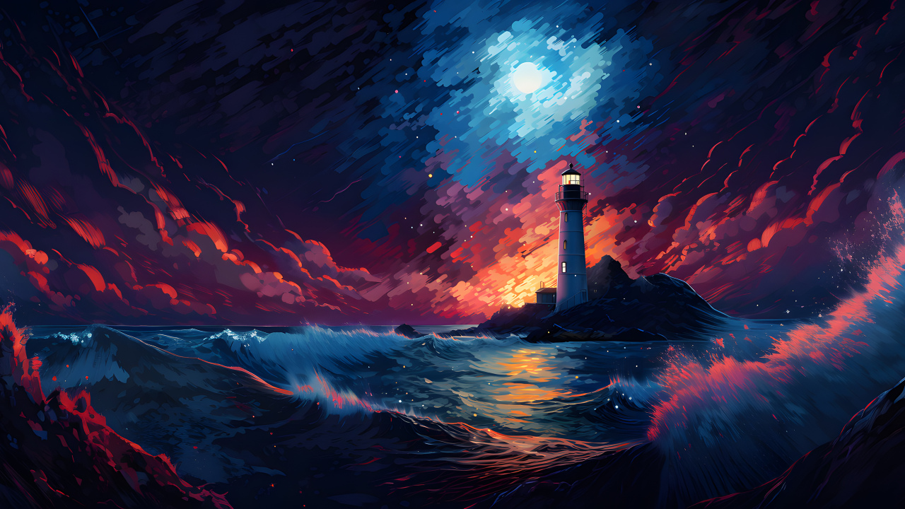 海景、灯塔、AI艺术、水、海浪、天空、云