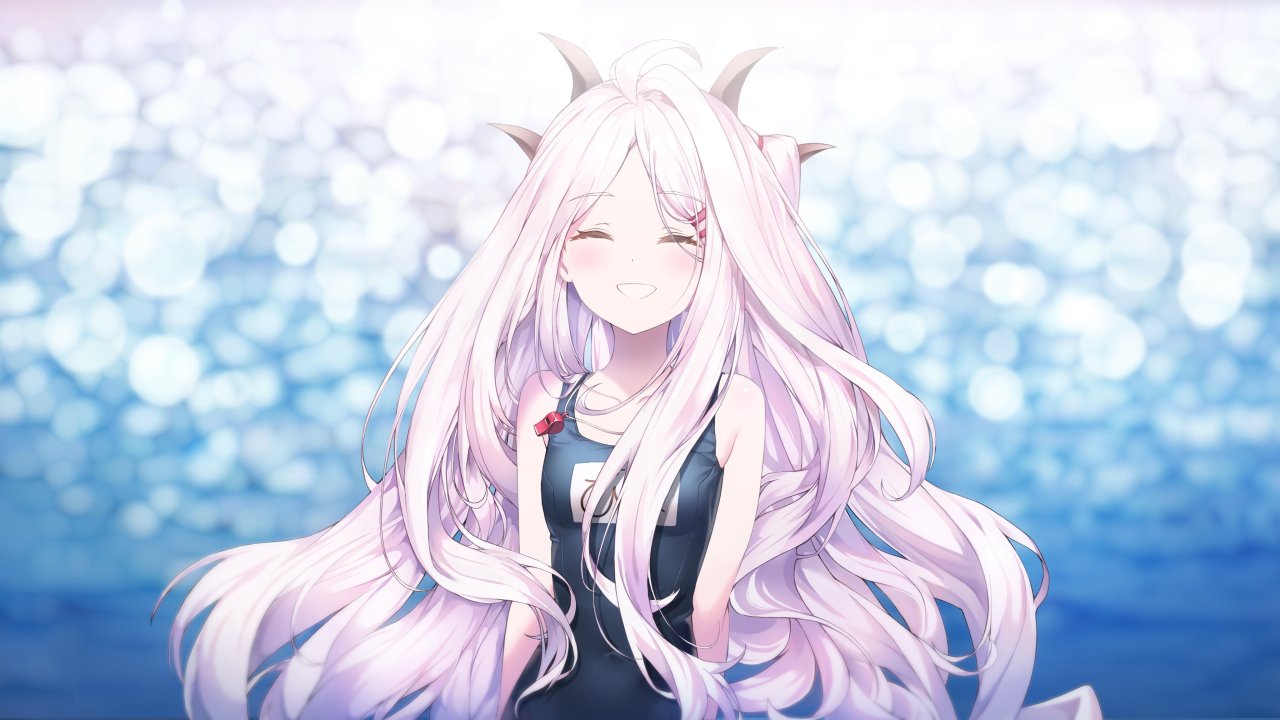 微笑、快乐、长发、白发、动漫、动漫女孩、学校、泳装、蔚蓝档案