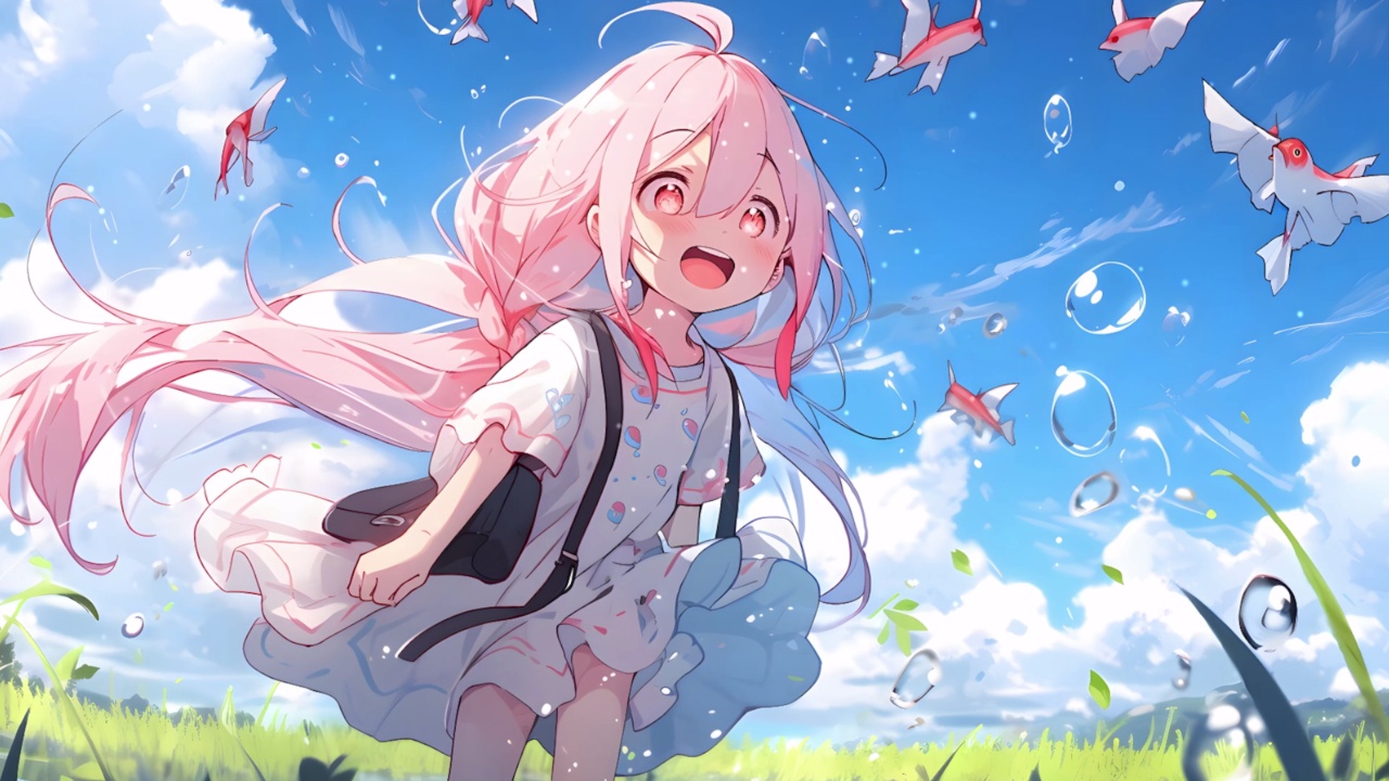 两个角色背对背,一个红发一个蓝发,背景是粉色天空和向日葵。
