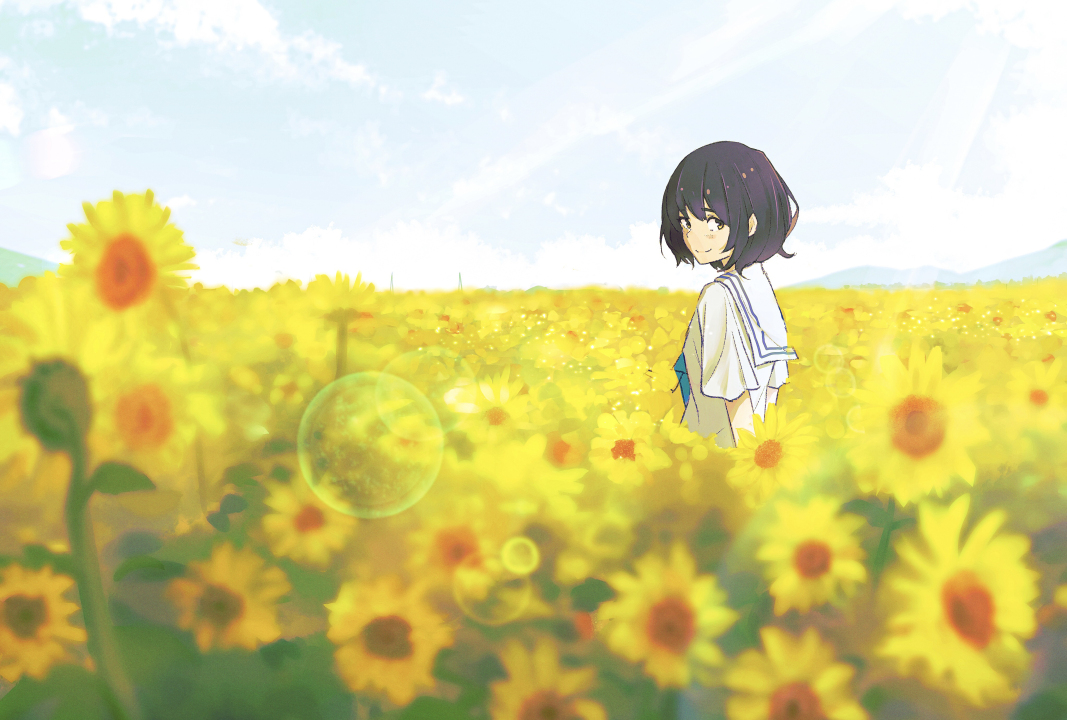 小次郎、女学生、微笑、短发、动漫、女孩、向日葵、黑发、校服、田野、鲜花、回望、云彩、天空