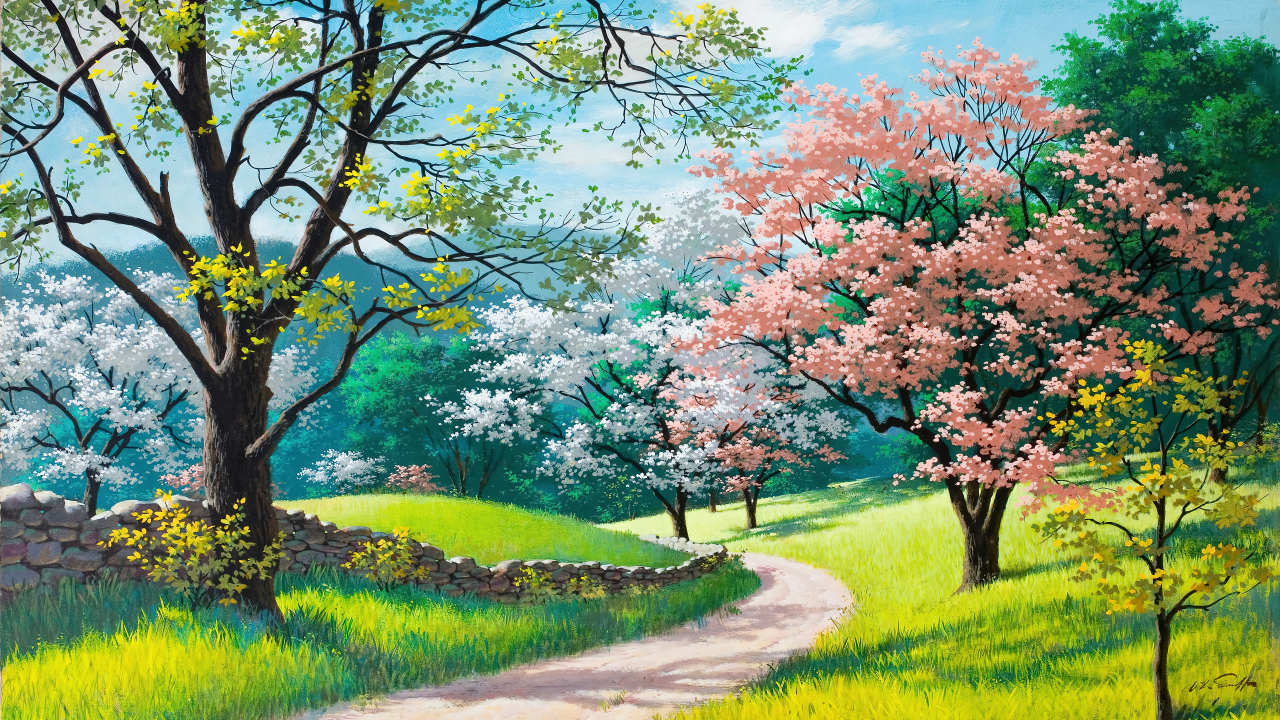 数字艺术、奇幻艺术、自然、花朵、树木、土路、田野、树枝、春天、路径、草地