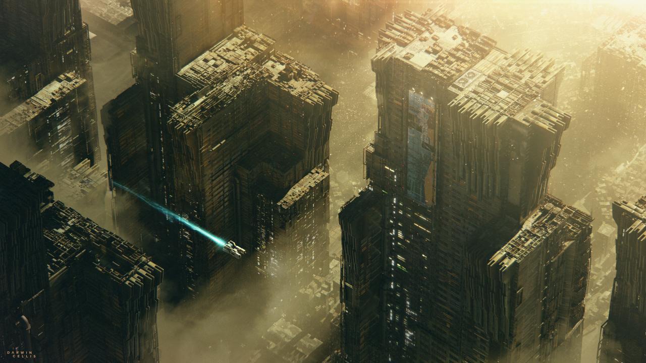 城市、城市景观、未来主义、赛博朋克、宇宙飞船、AI艺术、建筑、科幻、废墟