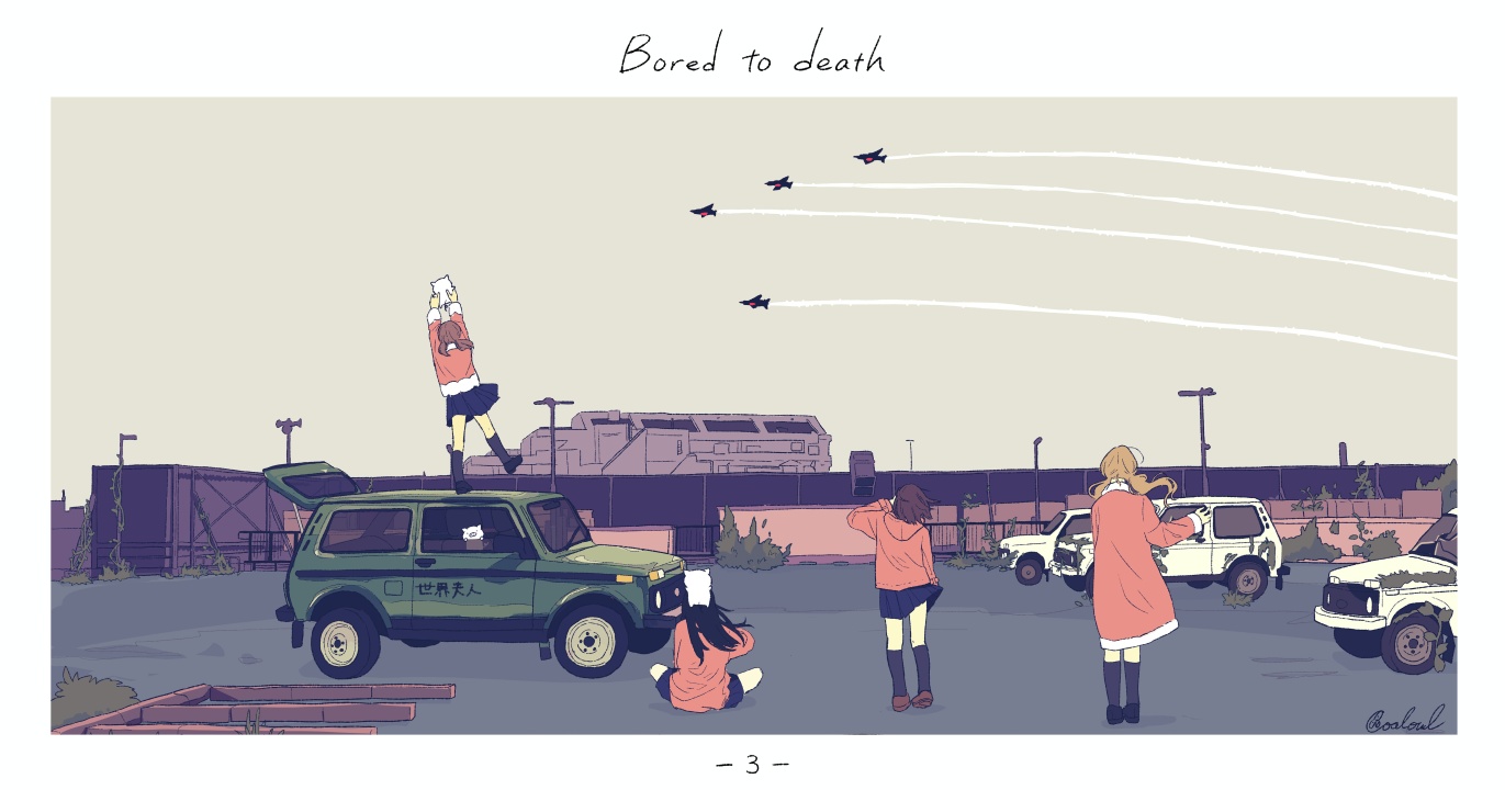 煤头鹰、站着、动漫、女孩、车辆、天空、飞机、汽车