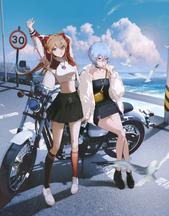 动漫、动漫女孩、明日香、绫波丽、新世纪福音战士、摩托车、机车、眼镜、袜子、天空、户外、裙子、连衣裙