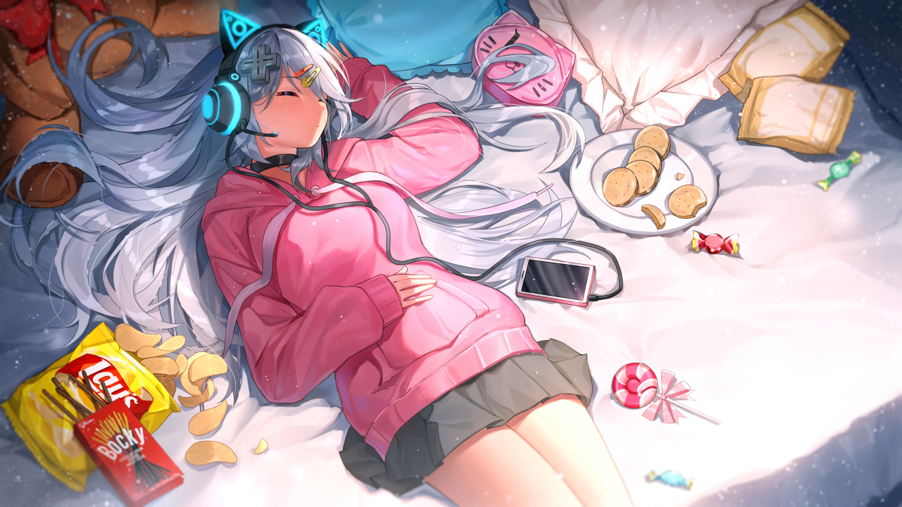 床上、长发、动漫、女孩、耳机、薯片、虚拟