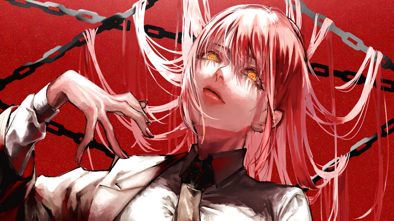 红发、电锯人、链、红色背景、黄色眼睛、动漫女孩