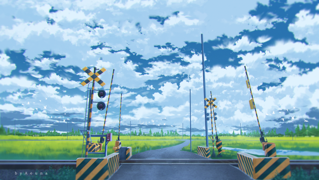 AI艺术、插画、云、铁路道口、环境、天空、风景、田野