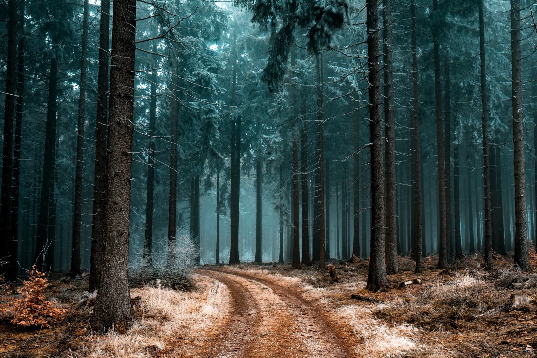 霜、冻、风景、自然、道路、树木、森林、雾棕色、绿色