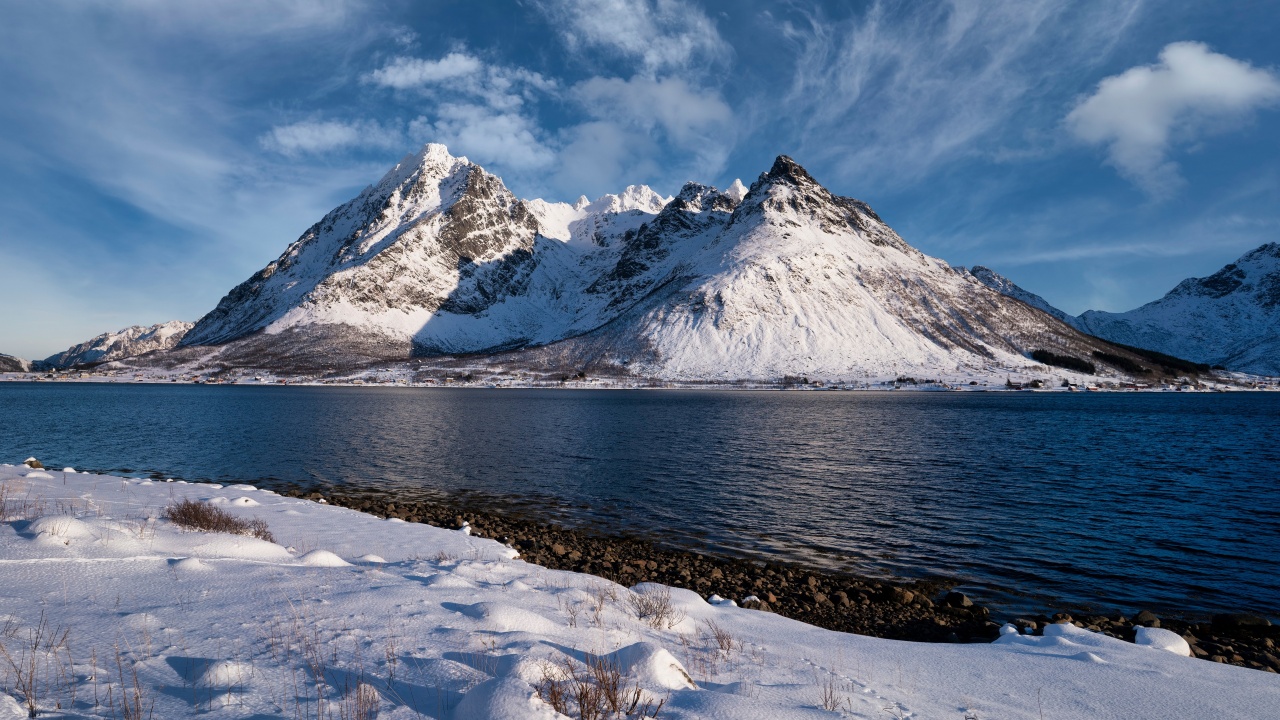 风景、冬季、雪地、自然、村庄、山脉、灯光