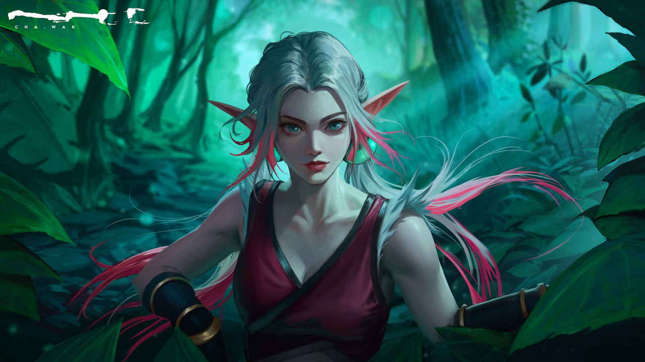 女人、幻想、女孩、长发、精灵、恰恰、数码艺术、插图、幻想艺术、兽耳、森林、自然、植物、叶子、树木、双色头发、树叶