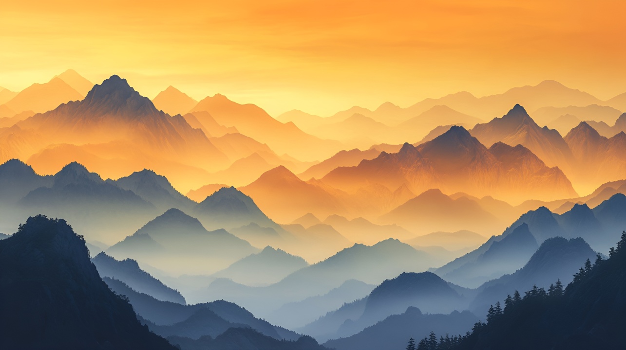 橙黄渐变下的层峦叠嶂”