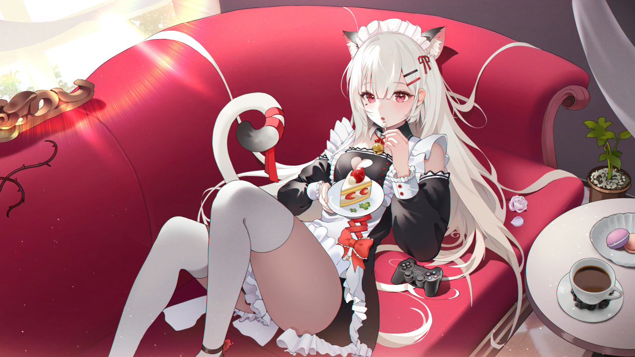 动漫女孩、银发、美食、咖啡、沙发