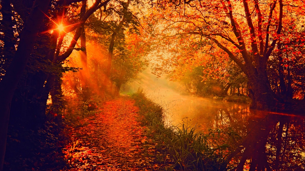 树木、河流、阳光、秋天、自然、落叶