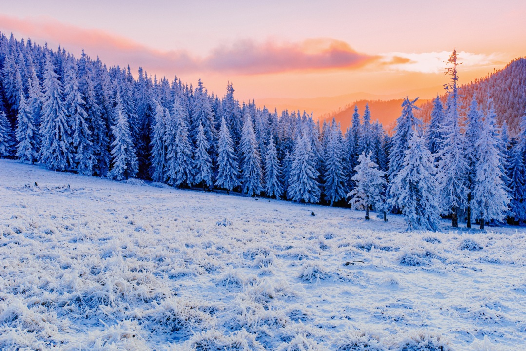 冬天、冷杉、自然、风景、山脉、日落、雪、天空、森林、树木、白色、寒冷、太阳、薄雾、阳光