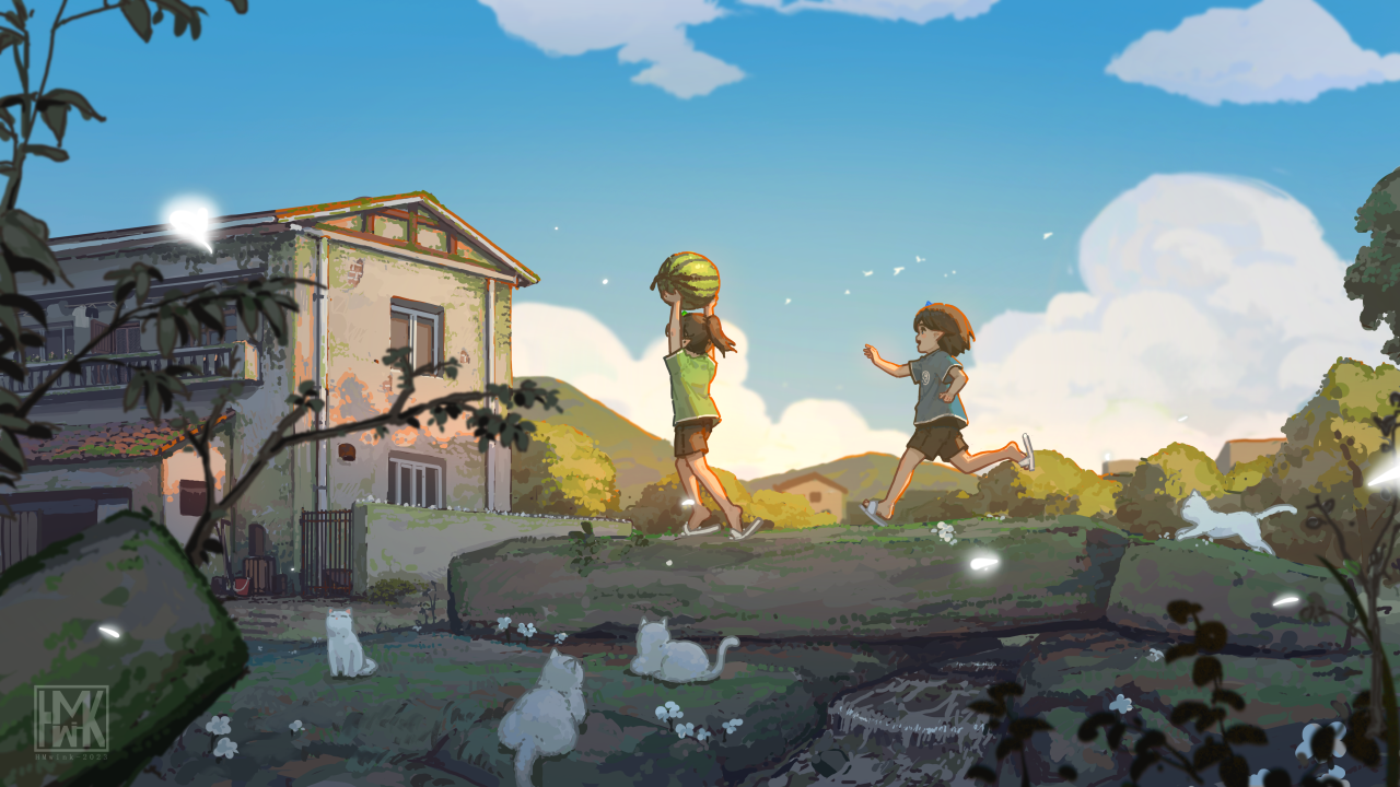 动漫、女孩、AI艺术、西瓜、天空、云、奔跑、猫、动物、树枝、树叶、兽耳、建筑