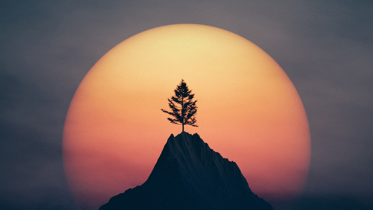 数字艺术、艺术品、插图、数字、绘画、风景、日落、太阳、树木、山顶