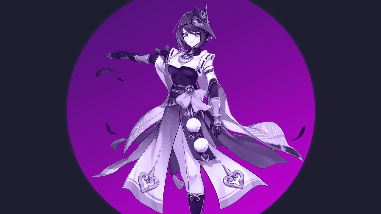 紫色、头发、极简主义、面具、动漫女孩、羽毛、简单、背景、原神