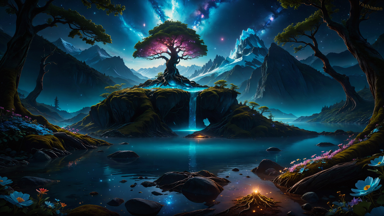 山脉、湖泊、数字艺术、风景、阴影、云、山谷、树木